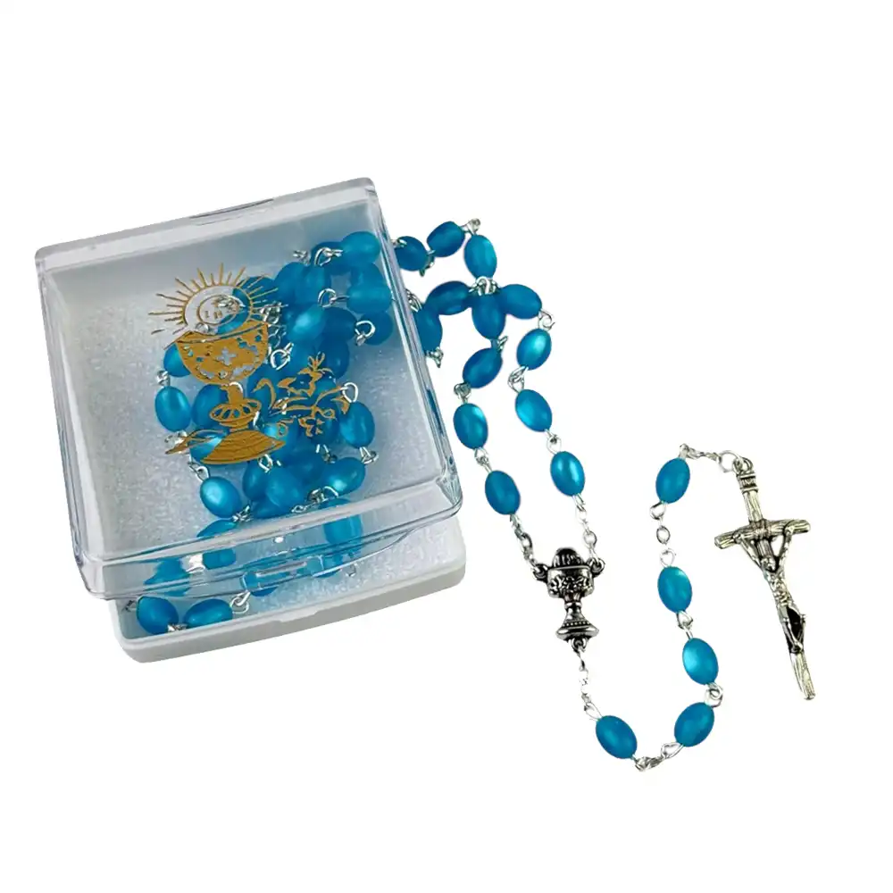Piękny komplet komunijny różaniec w pudełeczku składa się z delikatnego różańca oraz eleganckiego pudełeczka. Różaniec wykonano z błękitnych paciorków połączonych metalowymi elementami. Wyróżnia się łącznikiem w formie kielicha z hostią, który podkreśla sakralny charakter, oraz krzyżem papieskim nadającym mu klasyczny wygląd. To wysokiej jakości komplet komunijny, który sprawdzi się zarówno w codziennej modlitwie, jak i jako wyjątkowy prezent na Pierwszą Komunię Świętą.